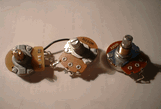 In the same guitar the customer told me the “luthier” had installed new pots because his old ones were worn out. (I saw the invoices so I know this is true) Certainly a nice matching set. One of the two tone controls is a linear taper pot while the other is an audio taper pot. And unfortunatatly I didn’t take a picture of the washers they installed trying to make the 3 different height pot bushings equal out so the knobs would be at the same height.