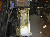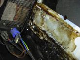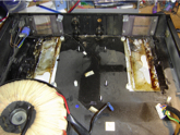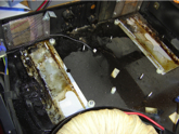 These pictures are of a Turbosound/MC2 sub-woofer amplifier that was housed in a Turbosound sub-woofer. The sub-woofers surround a dance floor in a popular nite club here in Las Vegas. The two “screened” ventilation windows on each amp are about waist high facing the dance floor. Apparently someone “mistook” these vents for “waste disposal” containers and poured a Rum & Coke into each one on this particular amplifier. The electronics were removed, disassembled, and washed in water to remove the residue. These pictures are the chassis of the amp with the electronics removed.